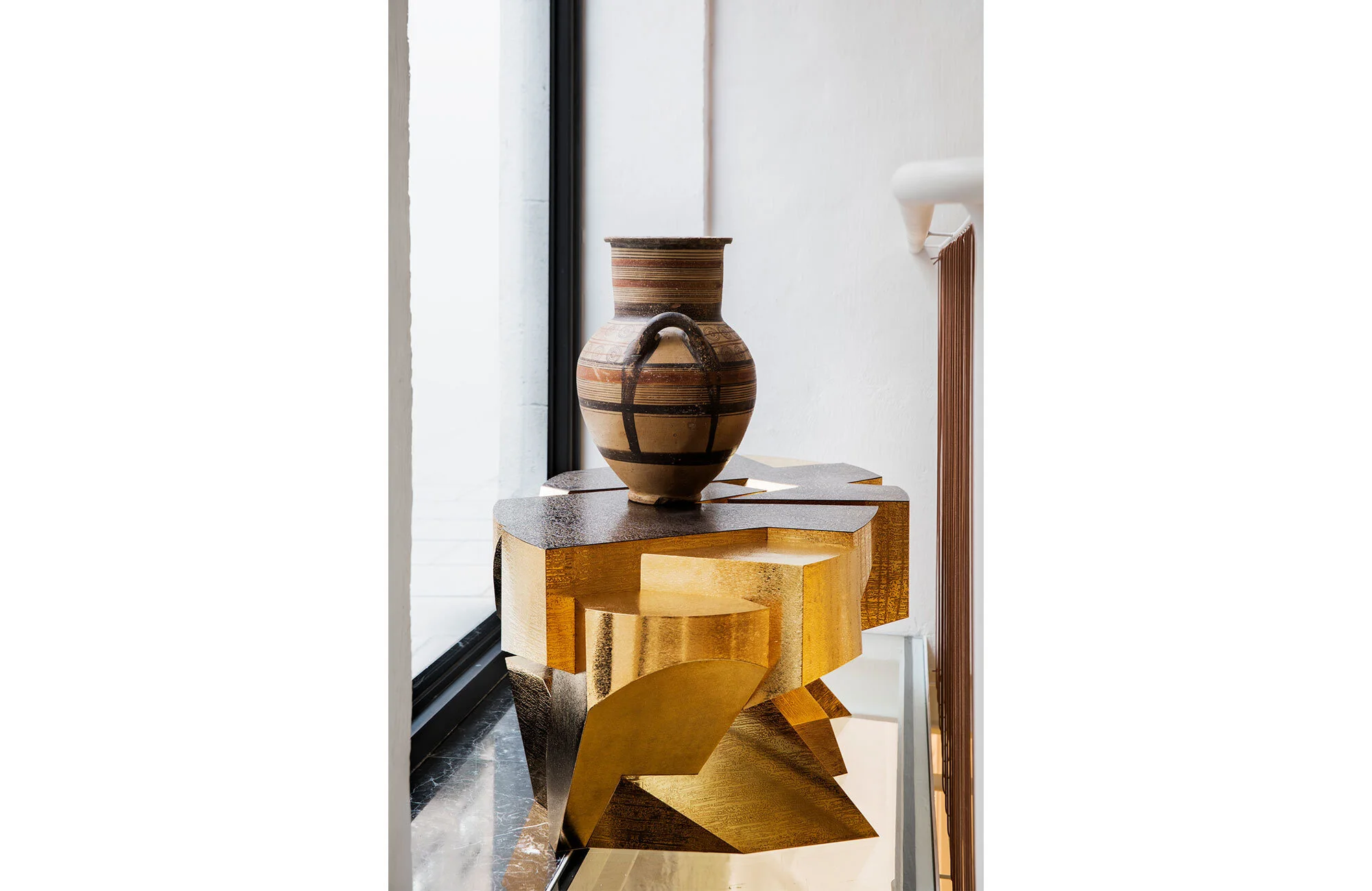 No sólo se aprecia un juego de yuxtaposiciones estéticas a lo largo de la exposición, sino que también se encuentran vínculos entre lo antiguo y lo nuevo, a través del uso de técnicas de orfebrería antiguas relacionadas, aplicadas tanto al mobiliario como a los objetos. Sorprende cómo piezas de diseño tan contemporáneo y arquitectónico pueden conseguirse mediante el uso de estas técnicas ancestrales que GARRIDO conserva en los procesos artesanales de su taller, permitiendo una calidad tan exquisita en sus acabados.